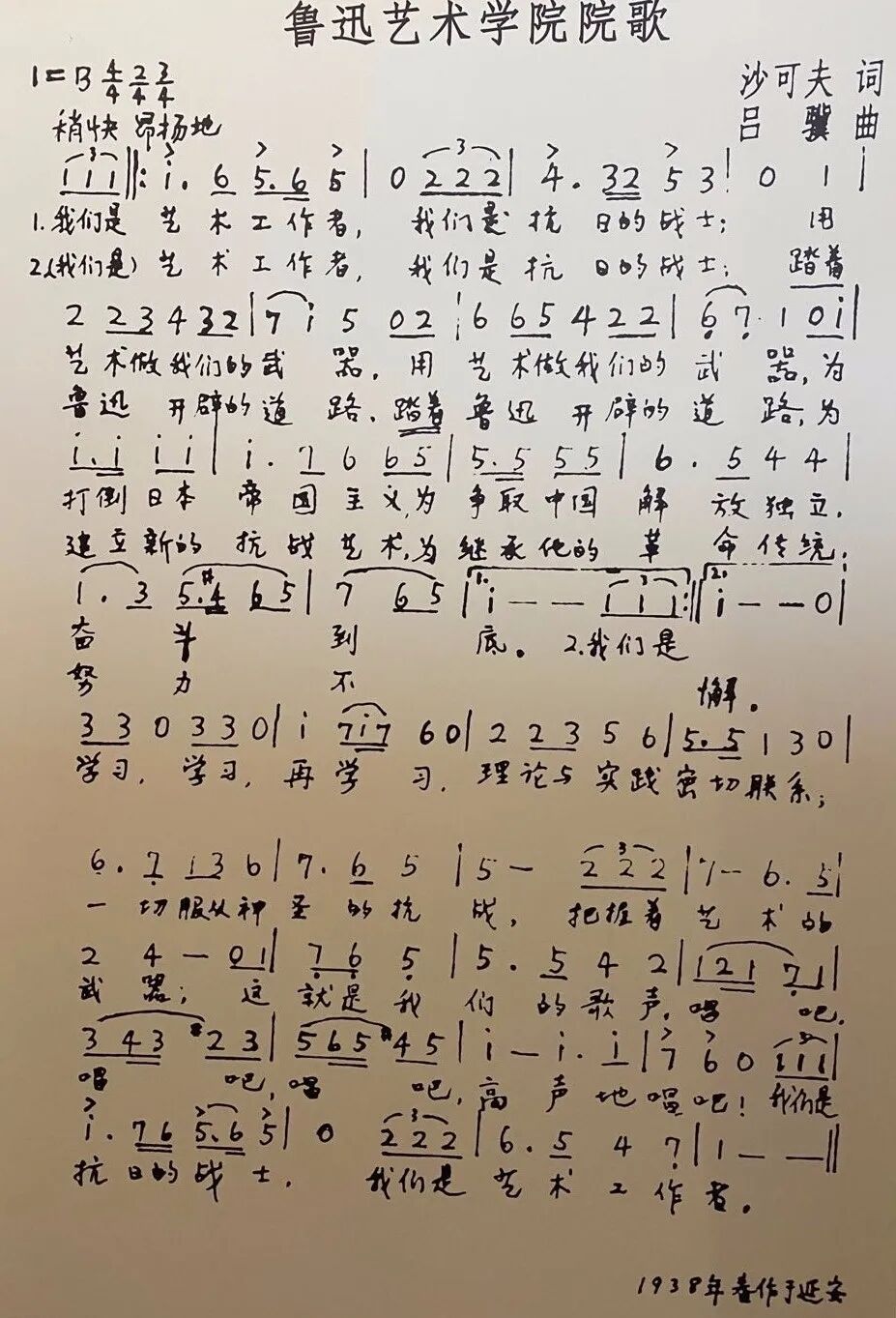 抗日战争时期,中国共产党在延安创办了20多所干部学校,每所学校都有属于自己的院歌。《鲁迅艺术学院院歌》它是时任副院长沙可夫与音乐系主任吕骥合作而成,从此“我们是艺术工作者,我们是抗日的战士,用艺术做我们的武器,为打到日本帝国主义,为争取中国解放独立,奋斗到底......”这首歌曲阐明办学宗旨,表达抗日爱国意志,抒发报效祖国情怀,弘扬紧张严肃活泼的学习作风。从校园里到校园外,红色校歌响遍延河两岸,响彻大江南北,直至今日鲁艺人唱起这首院歌时,内心依然满腔热血、心潮澎湃。