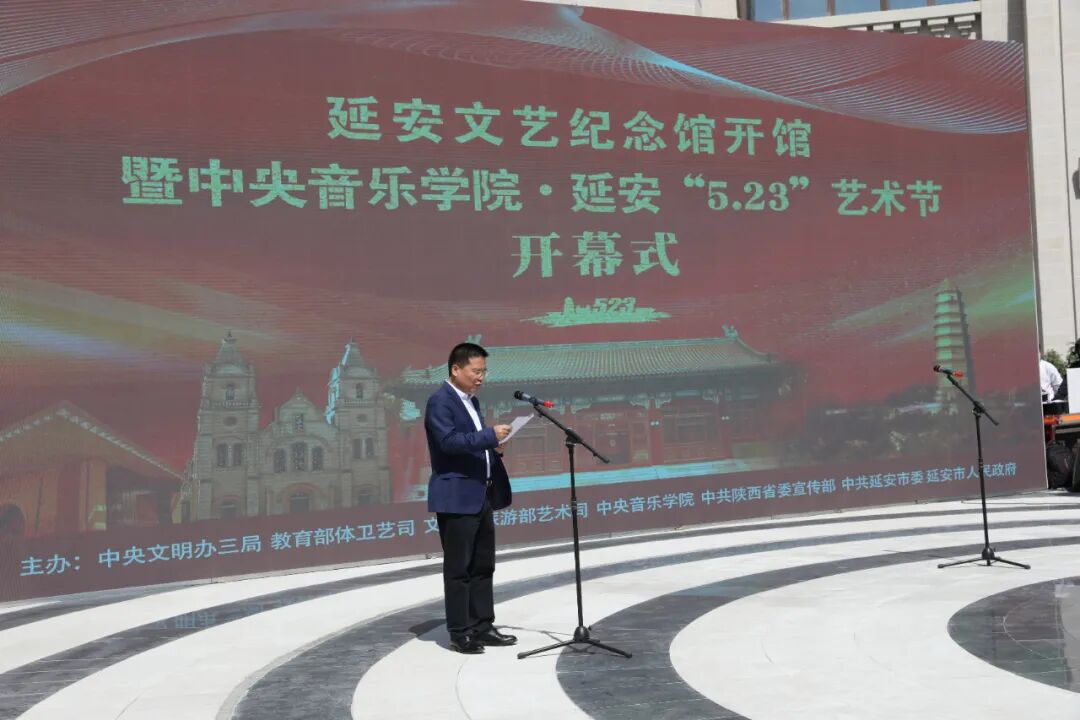 上午十时,延安文艺纪念馆开馆仪式暨第二届中央音乐学院·延安 “5.23”音乐节开幕式在鲁艺旧址延安文艺纪念馆圆形广场隆重举行。陕西省委常委、延安市委书记徐新荣,陕西省委常委、宣传部部长牛一兵,中央音乐学院院长俞峰,鲁迅美术学院党委书记王慎十,沈阳音乐学院院长季惠斌,陕西省人民政府原副省长、作家白阿莹,陕西省文旅厅厅长任宗哲,陕西省文物局局长罗文利,西安美术学院党委书记李智军等领导莅临参加。